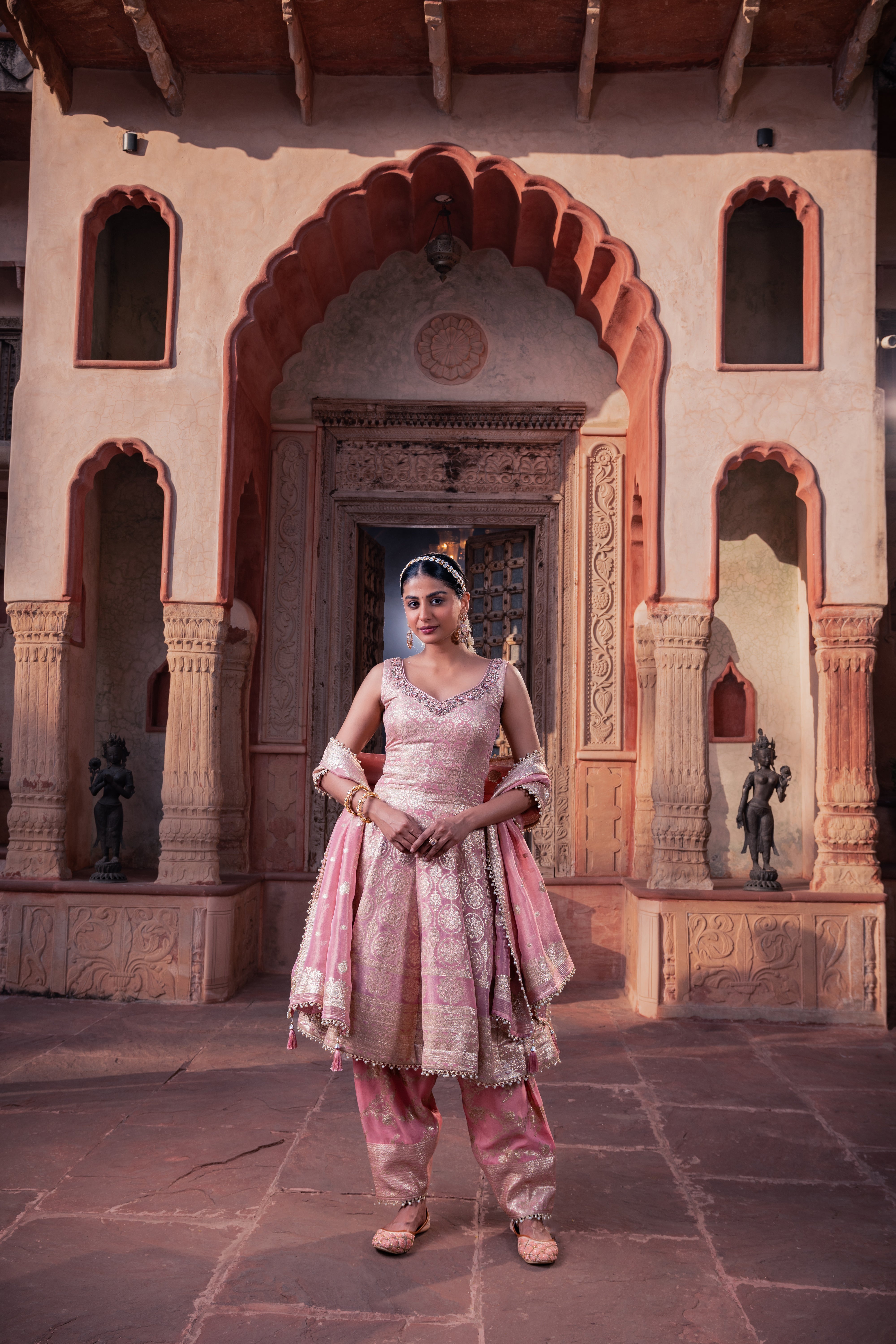 Channel timeless elegance with our Pink Brocade Sharara Set, a stunning ensemble that blends regal charm with contemporary grace. Crafted in lustrous woven silk and brocade, this three-piece set features an intricately embroidered kurta with silver zari and sequin detailing, paired with complementing sharara bottoms and a richly adorned dupatta. The delicate bead tassels and zari borders enhance its festive allure, making it a statement choice for weddings, receptions, and grand celebrations.